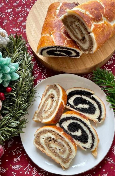- Spread the walnut filling on one, and poppy seed filling on the other, leaving ½ inch edges.