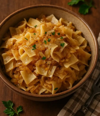 Heat oil/butter in a large skillet. Add onion (if using) and cook until soft. Add shredded cabbage and sprinkle with sugar. Sauté slowly over medium heat, stirring often, for 20–30 minutes until cabbage is soft, golden, and slightly caramelized. Season generously with salt and black pepper. - Mix & warm through: