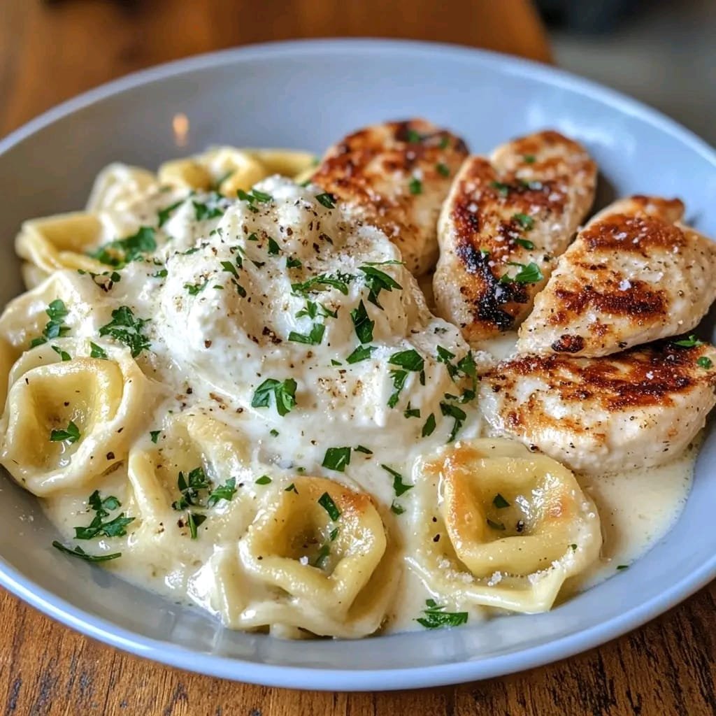 - Garnish with fresh parsley or basil, and enjoy your creamy, cheesy Asiago Tortelloni with grilled chicken!