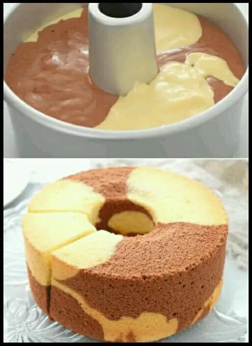 – Añade la mezcla blanca, y a continuación la de cacao, suelo hacer varias capas finas, siempre echando en el centro, una encima de otra.