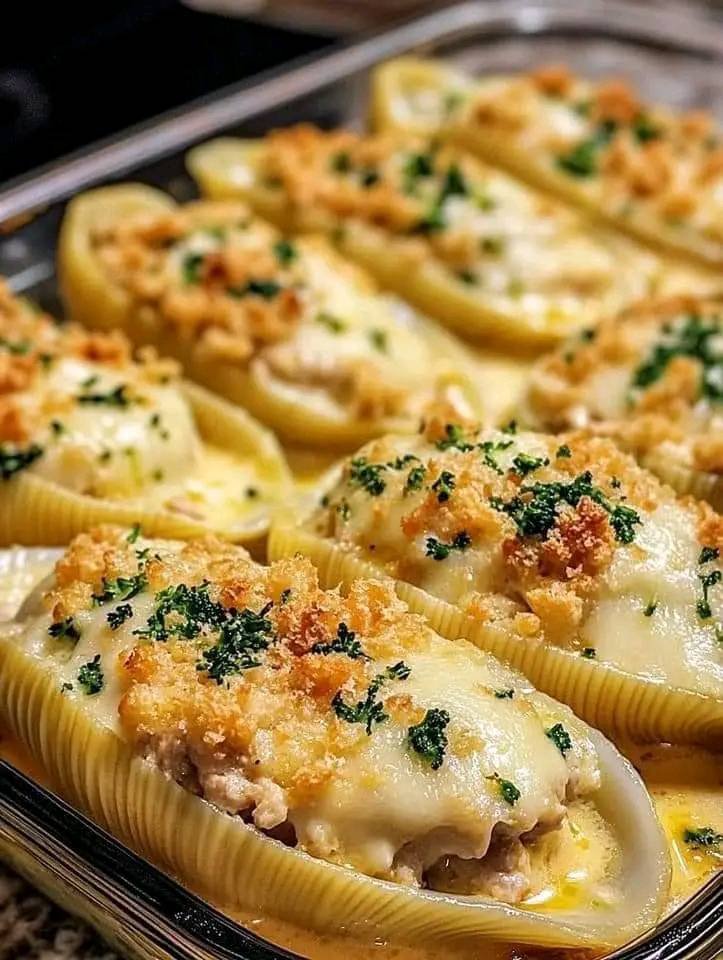 Stuff Shells: Spoon the chicken mixture into each cooked pasta shell.