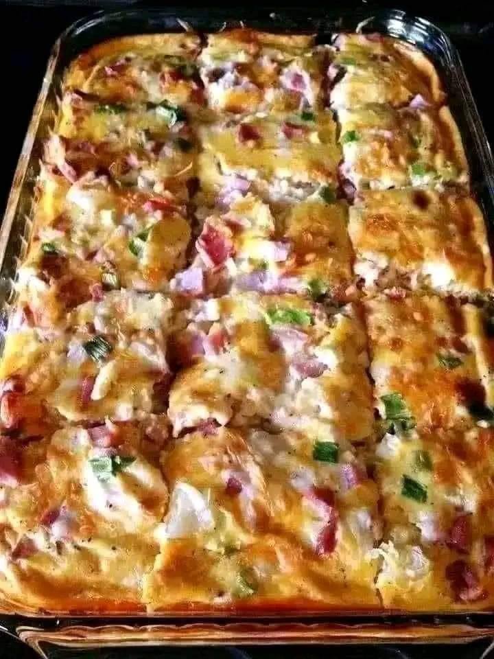 - Pour the egg mixture evenly over the layered ingredients in the baking dish. Make sure it covers all the ingredients well.