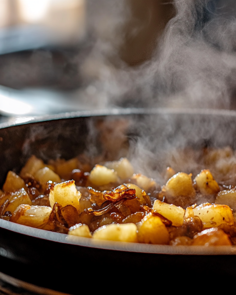 - Add the boiled potatoes to the skillet. Cook on medium-high heat, stirring occasionally, until the potatoes are crispy and golden brown.