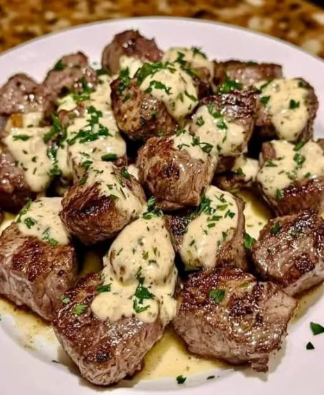 Add steak bites back into the pan. Spoon sauce over the top and sprinkle with parsley.