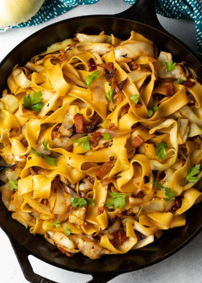 Boil noodles in salted water according to package directions. Drain and set aside. - Sauté the Onion and Cabbage: