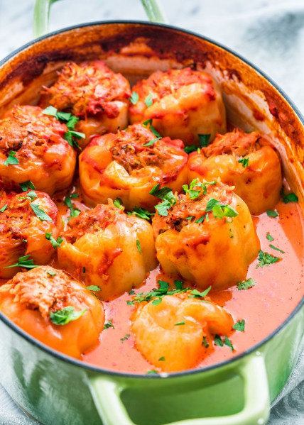 Carefully place the stuffed peppers (and any leftover meatballs) into the sauce. Cover and simmer on low heat for about 45–60 minutes, until the rice and meat are fully cooked. - Serve