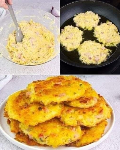 In a bowl, combine grated potatoes, eggs, ham, cheese, salt, and flour. Stir until you get a thick, sticky mixture. Add any optional seasonings now. - Cook the Fritters