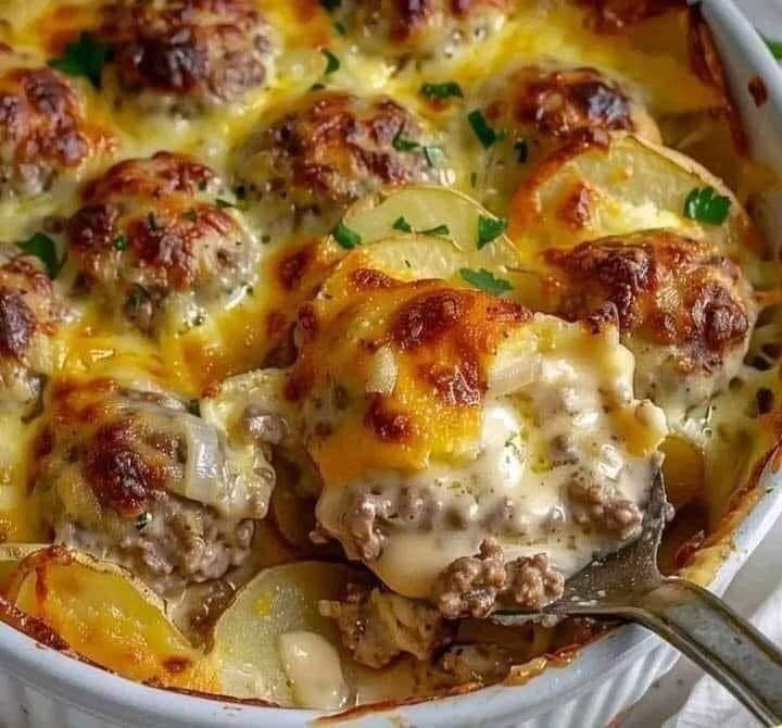 Pour the cream sauce evenly over the meatballs and potatoes.