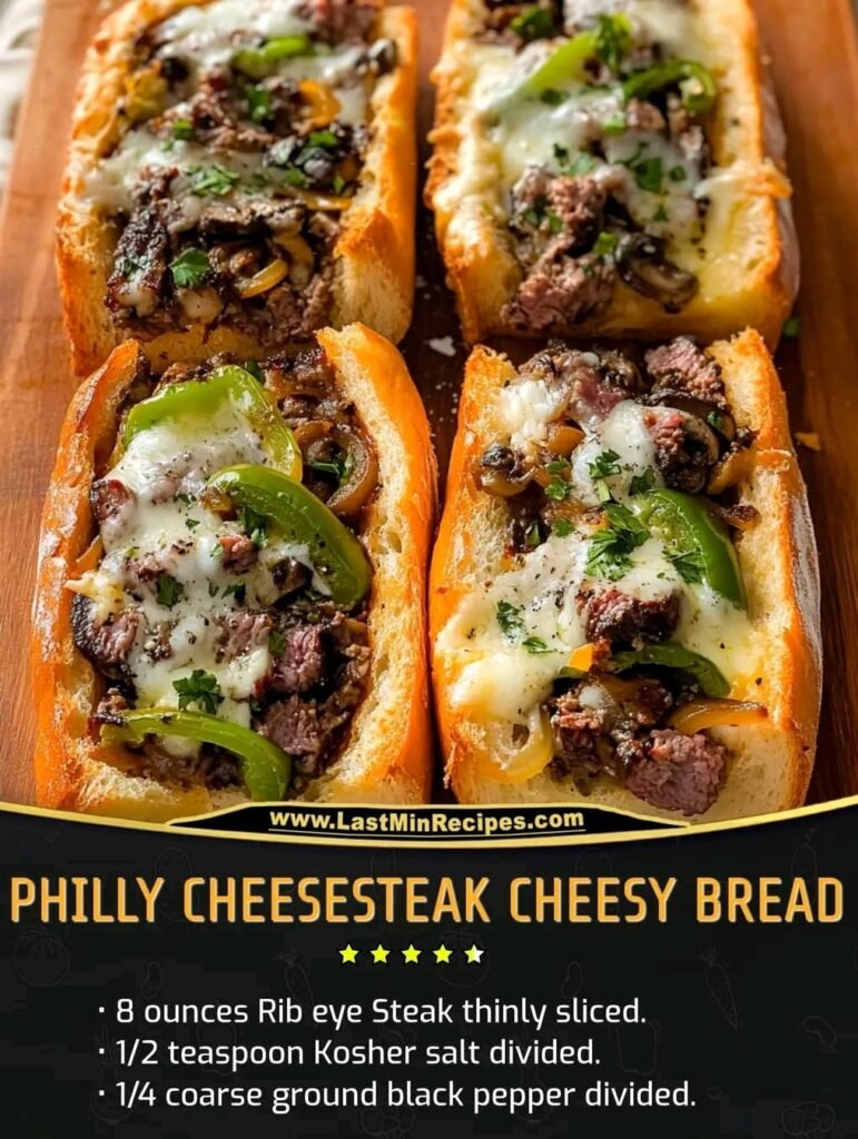Crunchy bread topped with flavorful cheese steak components, featuring thinly sliced beef, bell peppers, onions, and mushrooms, all melded with gooey cheese.