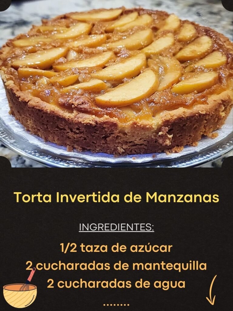 Coloca un plato grande sobre el molde y dale la vuelta con cuidado para que la torta caiga sobre el plato con el caramelo y las manzanas arriba.